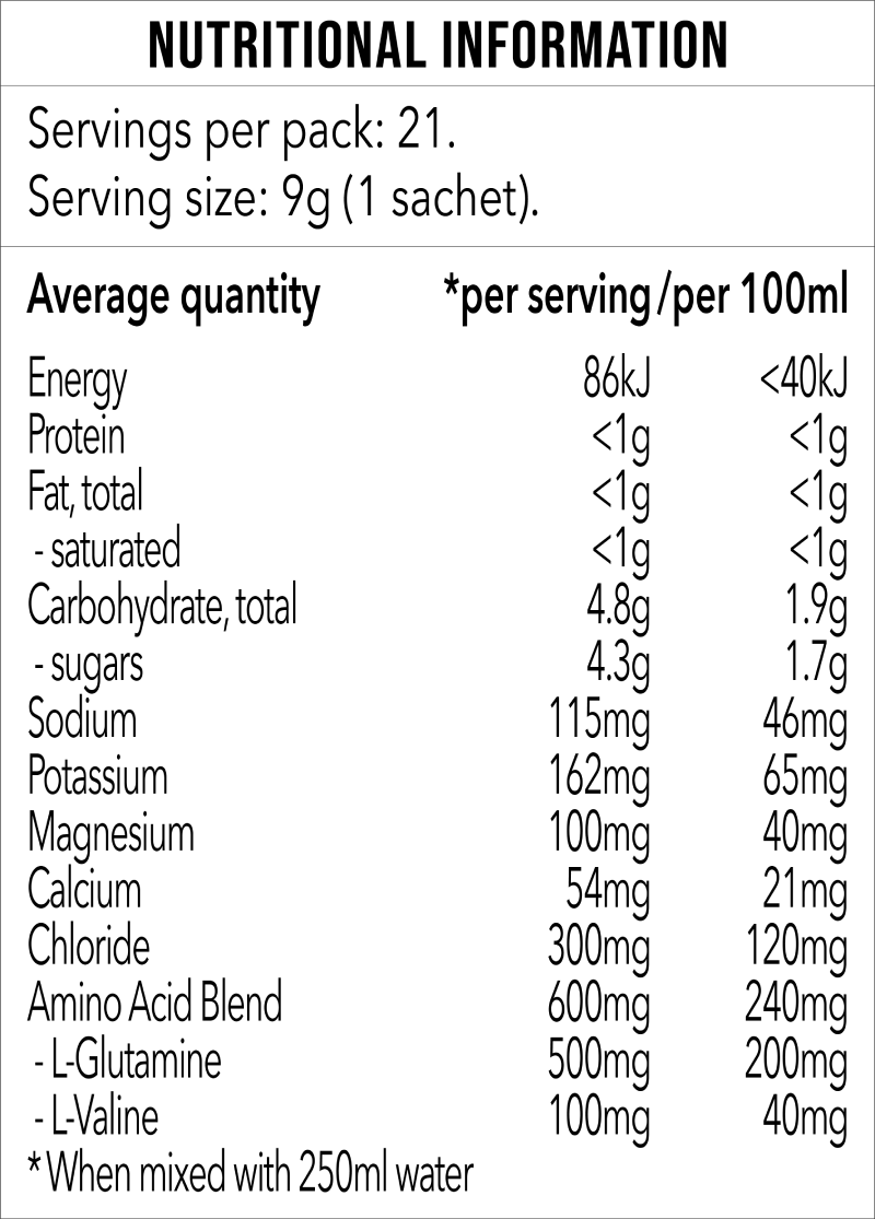 This refreshing formula contains L-Glutamine and L-Valine for recovery support, plus 5 key electrolytes; Sodium, Potassium, Chloride, Calcium and Magnesium, to help replenish energy and electrolytes after exercise and workouts.