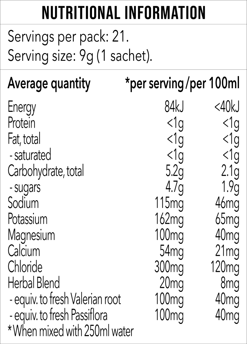 This refreshing formula contains Passiflora and Valerian Root for relaxation support, plus 5 key electrolytes; Sodium, Potassium, Chloride, Calcium and Magnesium, to help replenish energy and electrolytes after exercise and workouts.